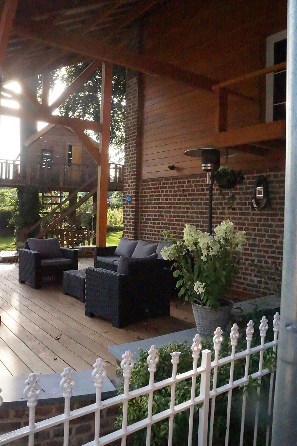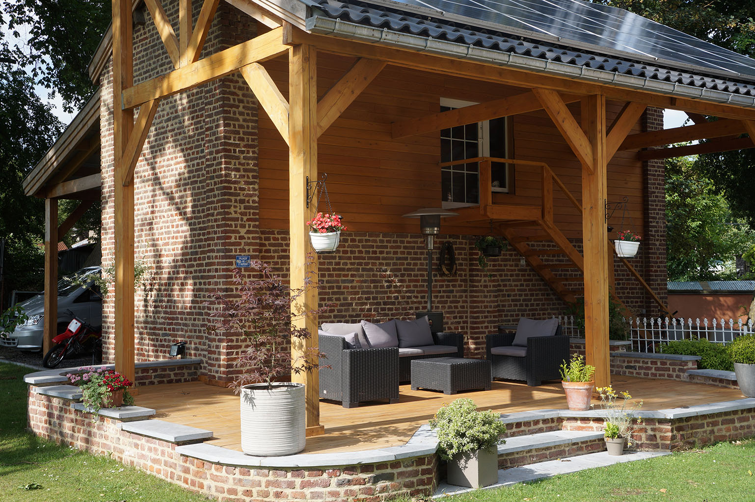 Maçonnerie de vieilles briques, terrasse et charpente en bois